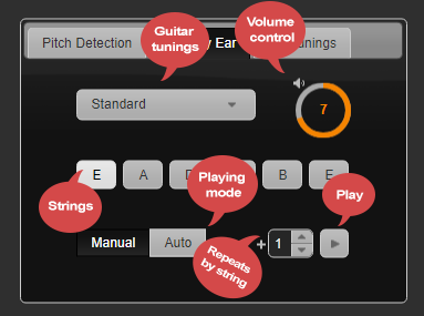 You can either click directly on the strings buttons or use the enter key to hear the sound.