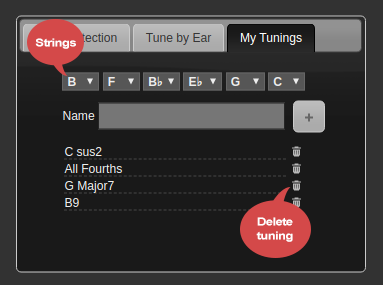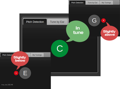 Tells you what note you are playing and whether it is in tune. Indicates whether the note is perfectly in pitch or is above or below.
